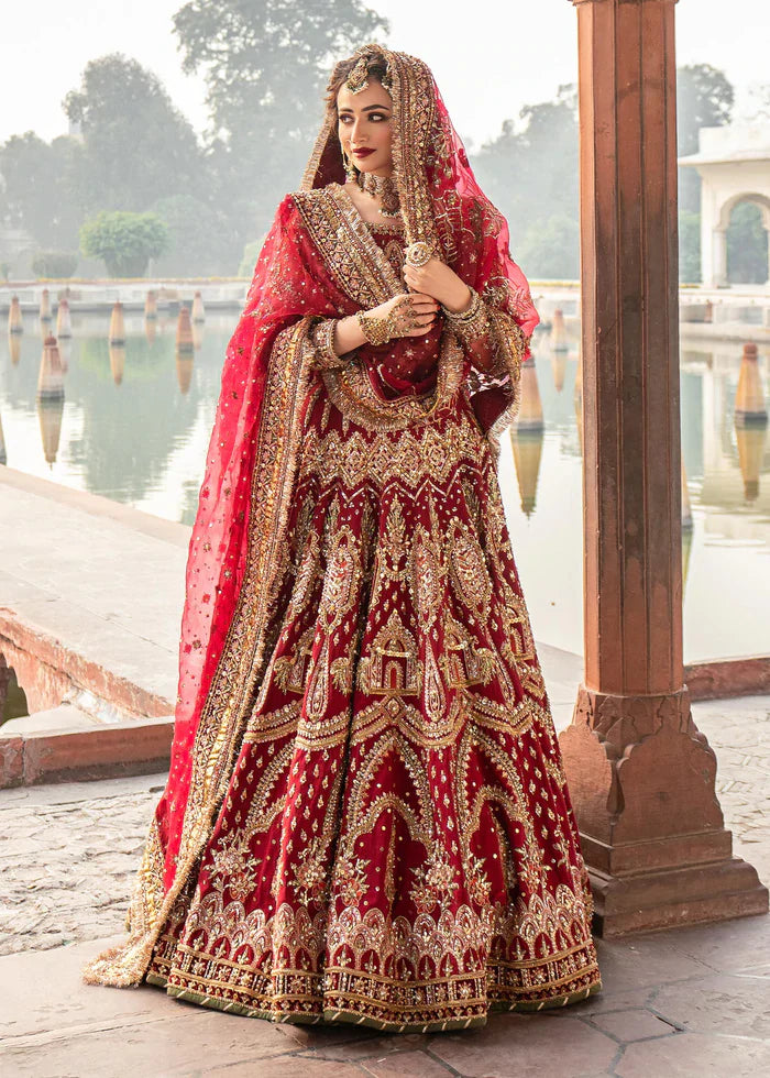 Description: Nigarbano is our signature sindoori bridal set that comprises of a raw silk lehnga choli extensively embroidered and composed using hand crafted embellishments of dabka, kora, sitari, pearl and marori. It comes with an embroidered and embellished dupatta finished with our signature chatta patti pallus and worn with a digitally printed silk shawl with hand embellished hammer work, dabka, pearl and gotta