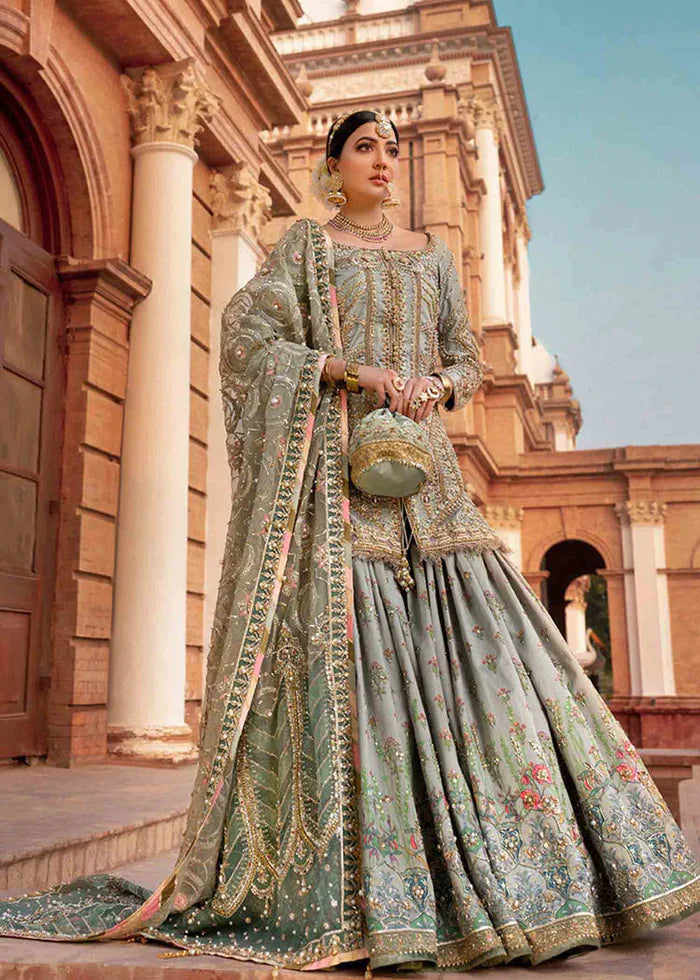 Description: Our Zamarbano bridal consists of a serene jade green gharara kameez. The shirt is heavily hand embellished and tailored in a shervani jacket style matched with a digitally printed raw silk gharara brought to life using our signature embroideries and hand embroidered borders. The heavy dupatta sports resham and tilla jaal with hand rendered pallus and a contrasting watermelon pink dupatta with a tilla and aari jaal.This is a 3 Piece Stitched Bridal Outfit