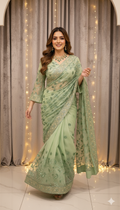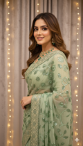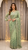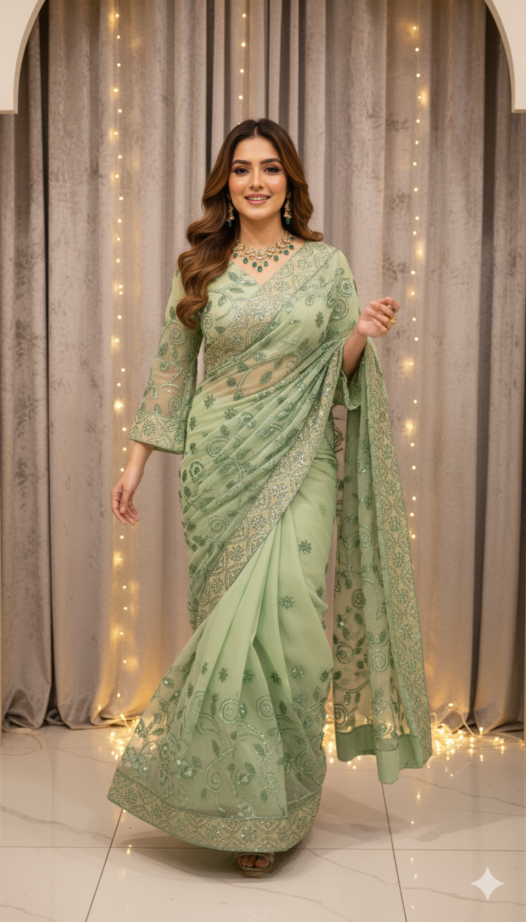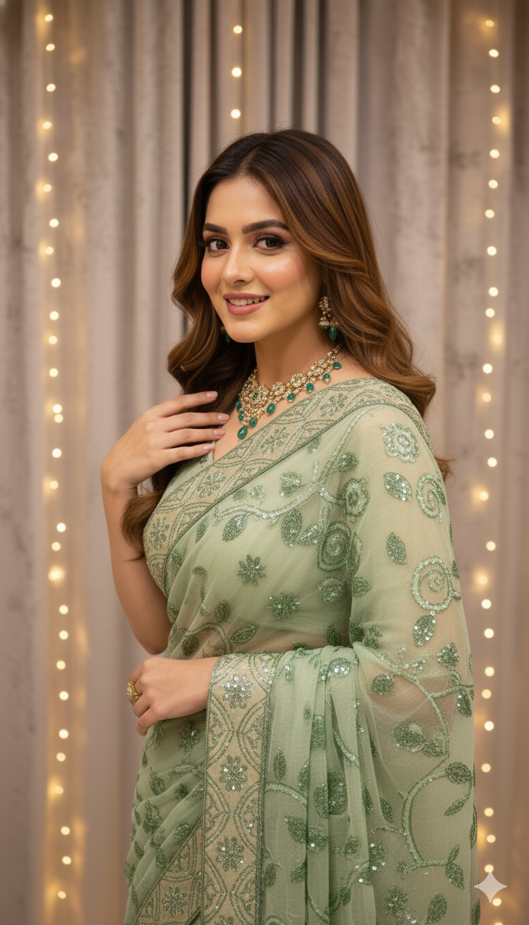A woman with flowing brown hair smiles brightly, wearing an elegant teal saree with intricate black floral embroidery and a matching border. She accessorizes with stunning silver jewelry in a gracefully posed picture.